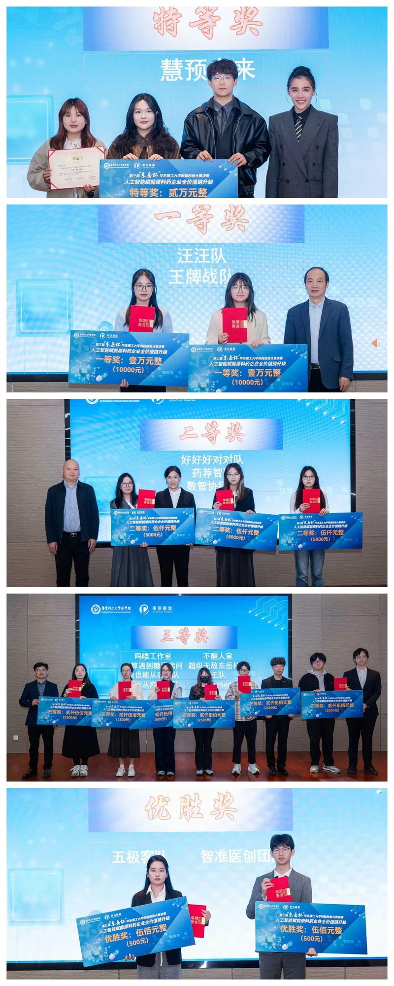 特等奖团队代表发表获奖感言,她感谢东岳药业搭建的学以致用、知行合一的优质平台。她认为这次获奖是肯定,更是新的起点,未来将继续深耕“技术走向产业、知识获得力量” 的初心,把人工智能与生物医药的创新研究做得更扎实,让技术真正服务产业、创造价值,不辜负这份荣誉与期待。