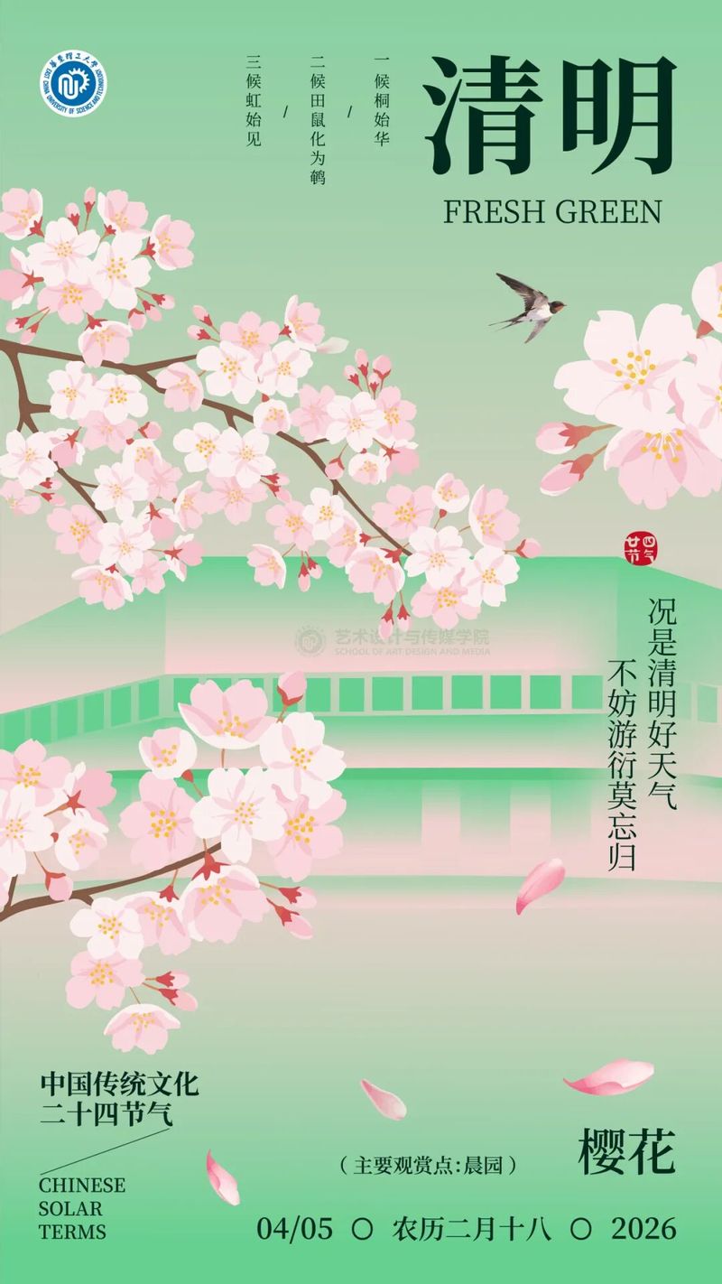 绘校园风物,传文化底蕴。华东理工大学艺术设计与传媒学院师生以二十四节气为脉络,推出系列校园主题海报,在清明樱花盛放之际,为校园文化添上一抹诗意与浪漫,也为上海高校樱花主题活动献上独具特色的华理答卷。