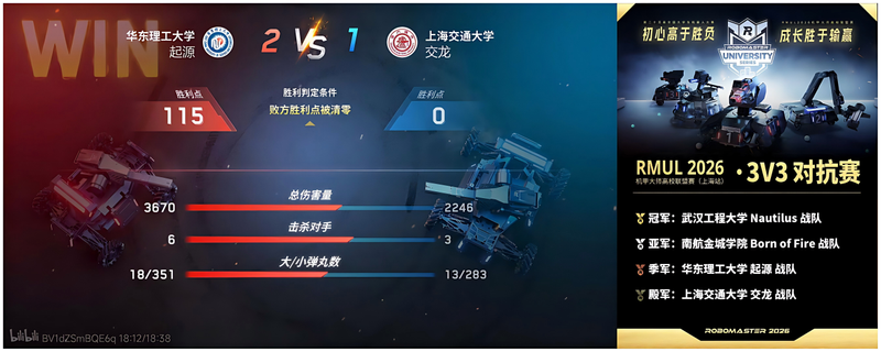 回顾本次比赛历程,起源战队凭借过硬实力以不败战绩挺进四强。半决赛中以1:2惜败于本届亚军南航金城战队。季军争夺战中,面对老牌劲旅、全国赛四冠王上海交通大学交龙战队,双方机器人在决赛日的高强度对抗中均有折损,队员们也接近体能极限。但两队依然为现场和网络观众奉献了一场极其精彩的机器人对决——四台轮腿战车如履平地,两台自动哨兵中场对垒,现场欢呼声与惊叹声随一次次机器人击杀此起彼伏。最终,起源战队凭借更佳的竞技状态险胜对手,为华东理工大学夺得大赛季军。