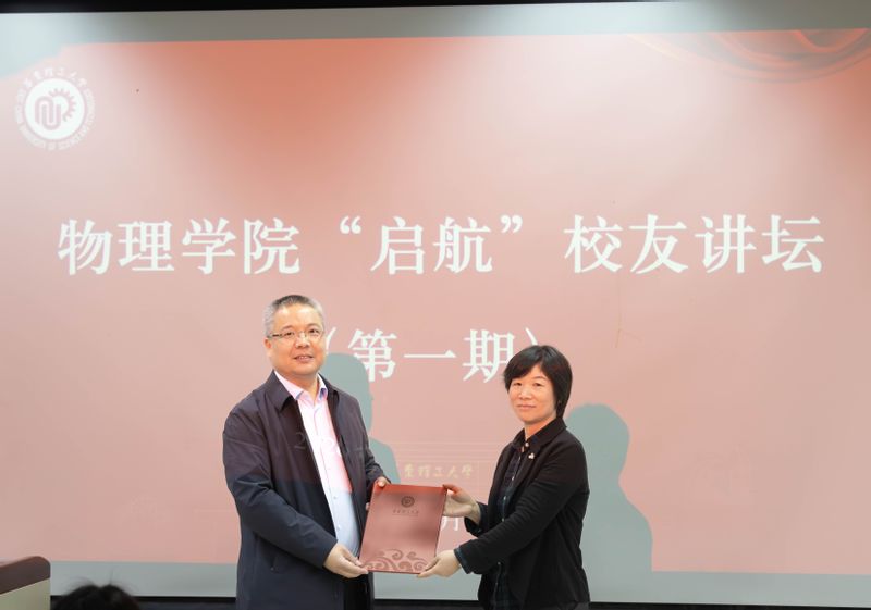 活动第一阶段为“启航”校友讲坛。首先举行了校友导师聘书颁发仪式,钮月萍书记为邵爱军校友颁发校友导师聘书,正式聘请其担任物理学院校友导师。