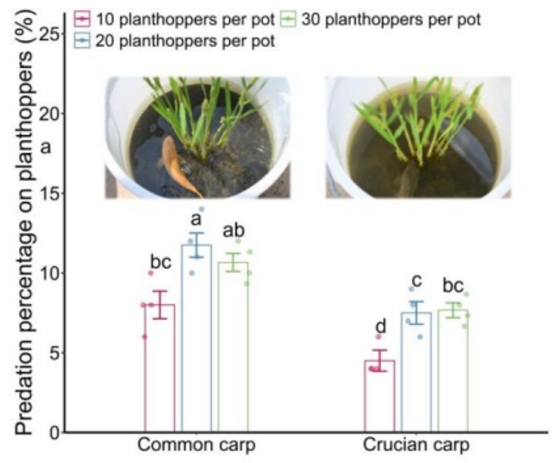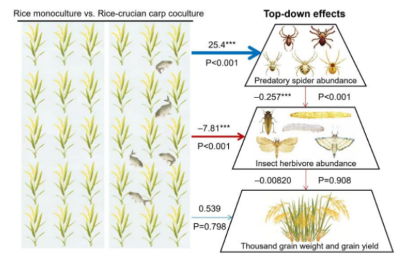 为进一步验证上述全球效应,万年峰课题组开展了连续4年的野外田间试验,研究证实:稻鱼共生区内的稻飞虱、螟虫、卷叶螟等主要害虫数量明显低于水稻单作区的,而捕食性蜘蛛数量则更高(图5);养鱼后水稻千粒重和产量也增加(图6);路径分析表明,稻鱼共生通过增加天敌数量来抑制害虫,进而实现间接增产效应(图7)。盆栽行为学实验进一步阐明机制:鲫鱼和红鲤鱼等鱼类偏好取食害虫(褐飞虱),而不捕食捕食性狼蛛(图8)。这意味着,鱼类在稻田中扮演着“精准调控者”的角色,既直接削减了害虫,又保护并强化了田间的天然“控害军团”,从而建立了一种高效的协同控害网络。