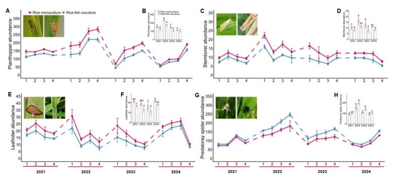 图5 四年野外试验证实:稻鱼共生模式抑制害虫和保育捕食性蜘蛛