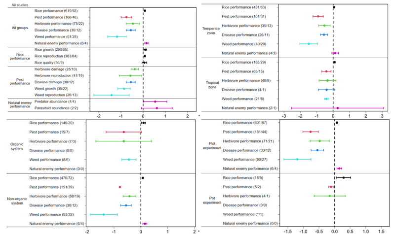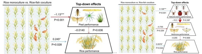 全球数据分析表明,与水稻单作相比,稻鱼共生使水稻产量平均提升12.5%,水稻增产因鱼的种类不同而不同(图2);与单一种植水稻相比,稻鱼共生可使产量提高12.5%,同时使无脊椎天敌(捕食者/寄生者)数量增加99.3%,并有效抑制害虫(减少24.1%)、病害(减少38.8%)和杂草(减少45.7%)(图2);就不同气候带、水稻类型和试验类型而言,温带控害与增产效果比热带的效果好,非有机稻田控害与增产效果比有机稻田的效果好,小区试验控害与增产效果比盆栽试验的效果好(图3);下行效应路径分析结果显示,在水稻-病虫草害二营养级互作系统中,稻鱼共生通过抑制有害生物来增产,在水稻-害虫-天敌三营养级互作系统中,稻鱼共生通过增加天敌数量来抑制害虫,进而实现间接增产效应(图4),将全球数据分成不同气候带、水稻类型和试验类型后,这种下行控制作用在有机与非有机系统、温带与热带地区均持续存在,即稻鱼共生→促进天敌种群→抑制害虫→促进水稻生产力。