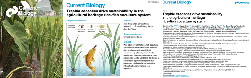 近日,我校药学院万年峰教授课题组,联合中、英、法、美、德、瑞士、丹麦、西班牙等国家的科研人员,在国际生物学著名期刊Cell子刊—Current Biology上以封面文章形式发表了题为“Trophic cascades drive sustainability in the agricultural heritage rice-fish coculture system”研究性论文。该研究为具有数千年历史的稻鱼共生模式(全球重要农业文化遗产)提供了坚实的科学依据。研究整合了全球18个国家的实验数据,并在中国东部开展了长期田间定位与行为学实验,系统证实了这一古老农艺不仅能增产,更能通过生态调控机制控制病虫害,为生态农业转型与保障粮食安全开辟了科学路径。