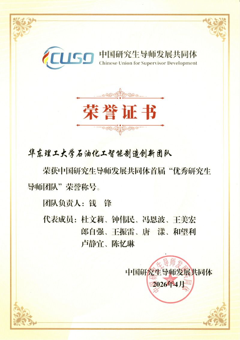“华东理工大学石油化工智能制造创新团队”由中国工程院院士钱锋领衔,现有科研人员38人,其中中国工程院院士1人、国务院控制科学与工程学科评议组成员1人、何梁何利科学与技术创新奖获得者1人、国家973计划首席科学家1人、国家特聘专家(创新类)3人、万人计划领军人才3人、国家杰出青年科学基金获得者3人、国家优秀青年科学基金获得者3人、国家海外高层次人才引进计划入选者3人、科睿唯安全球高被引科学家1人、爱思唯尔中国高被引学者2人。团队先后入选科技部重点领域创新团队、全国黄大年式教师团队,获中国仪器仪表学会科技进步奖(创新团队)、中国自动化学会科技进步创新团队奖。