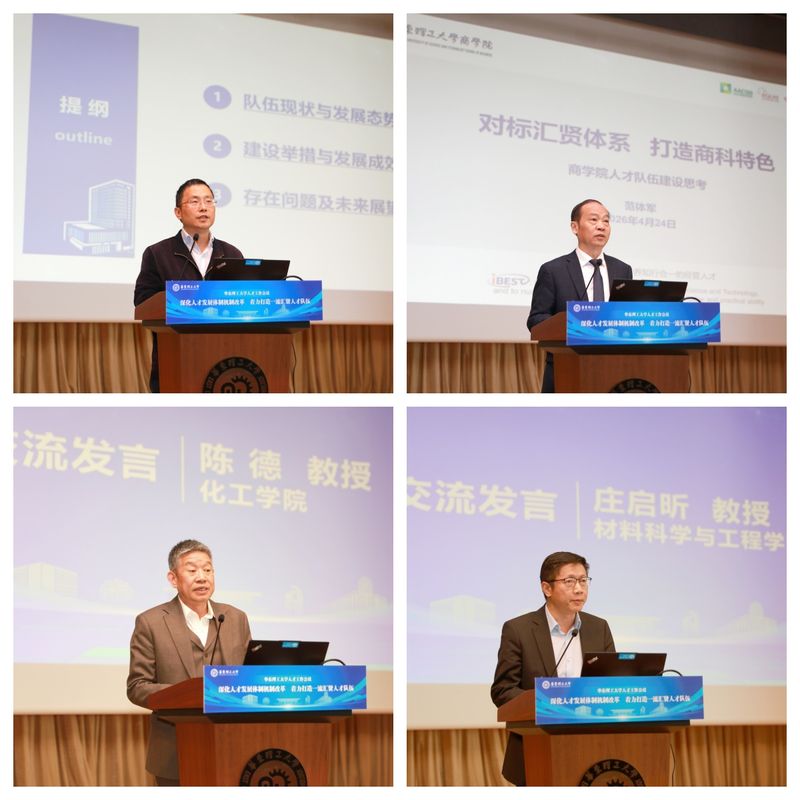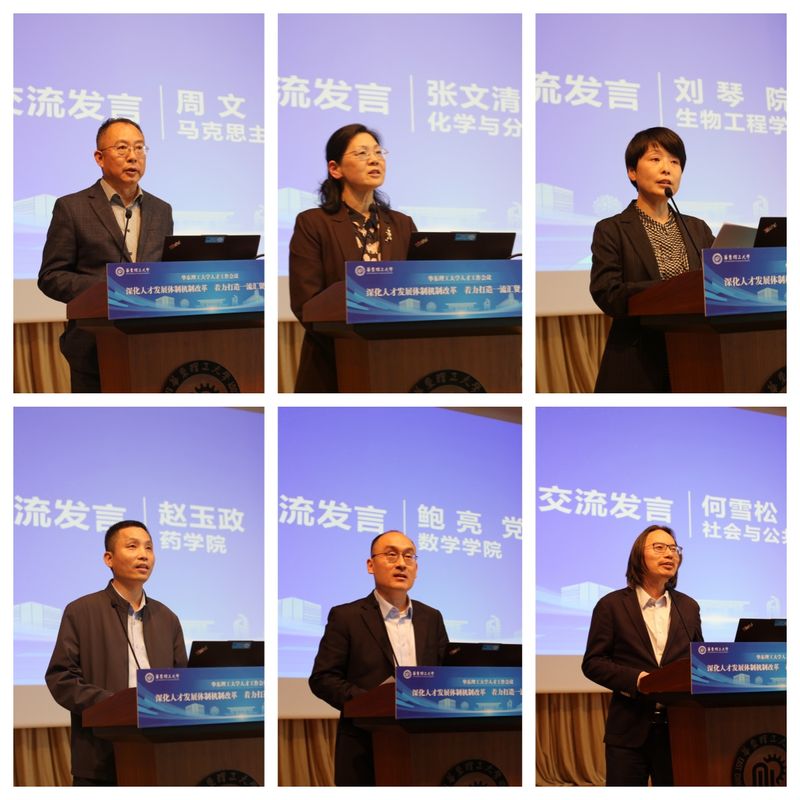 信息科学与工程学院院长钟伟民、商学院院长范体军分别介绍了学院引才育才的工作举措与推进成效。化工学院陈德教授作为高层次人才代表,分享了自己回国从教、扎根华理干事创业的经历。材料科学与工程学院庄启昕教授作为名师代表,讲述了自己一家三代七人坚守教育初心、传承师道使命育人的感悟。