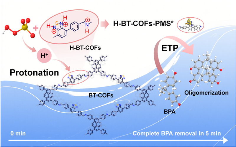 传统的过氧单硫酸盐(PMS)活化过程通常遵循以催化剂为中心的静态模式,受限于自由基介导的反应路径,导致选择性有限且矿化不完全。突破这一传统框架,该研究建立了一种基于过程驱动的质子化策略,将PMS活化导向主导性的电子转移过程(ETP),从而实现污染物的选择性低聚。通过开发苯并噻二唑整合共价有机框架(BT-COFs)作为模型平台,研究证实PMS的加入会内在地酸化反应介质,从而在特定氮位点触发框架的原位质子化。这种自诱导质子化作用如同分子开关,重组界面电子结构并形成极化催化界面,促进定向电子转移而非自由基生成。因此,通过ETP导向的低聚路径,可在5min内实现污染物双酚A的完全去除(kobs=1.68min-1),且动态催化界面可通过简单过程进行再生,在复杂水介质中展现出优异的稳定性。本研究赋予了PMS作为活性界面调节剂的新定义,并为设计用于可持续环境修复的智能无金属体系提供了一种动态、过程自适应的新范式。