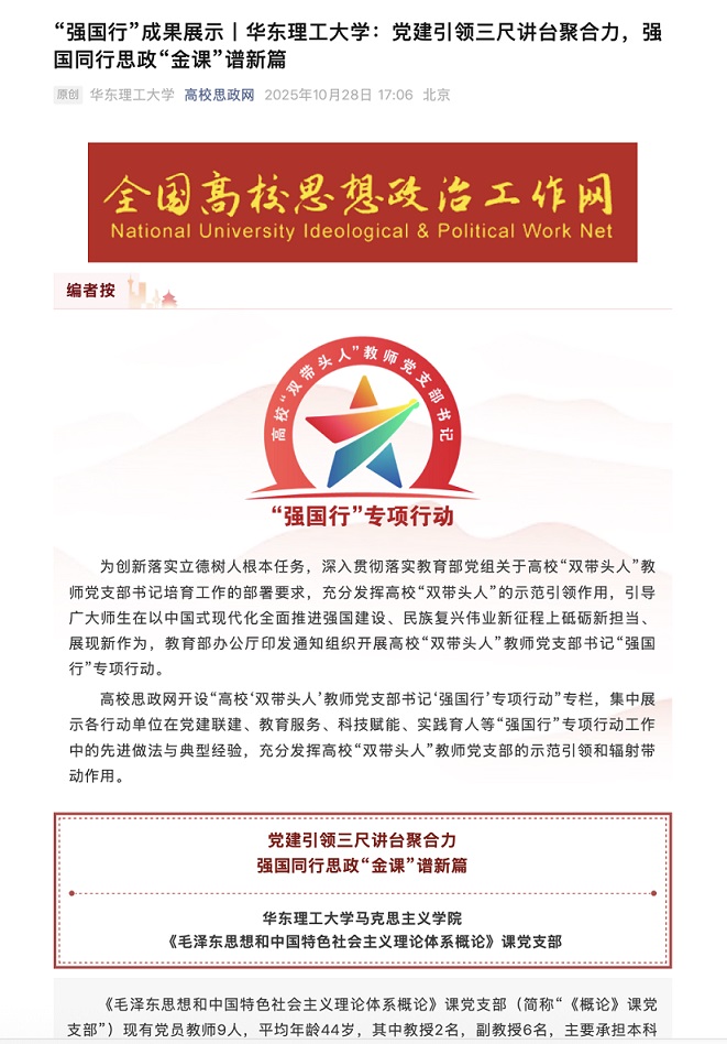 近日,全国高校思想政治工作网及官方公众号以《华东理工大学:党建引领三尺讲台聚合力,强国同行思政“金课”谱新篇》为题,对我校马克思主义学院...